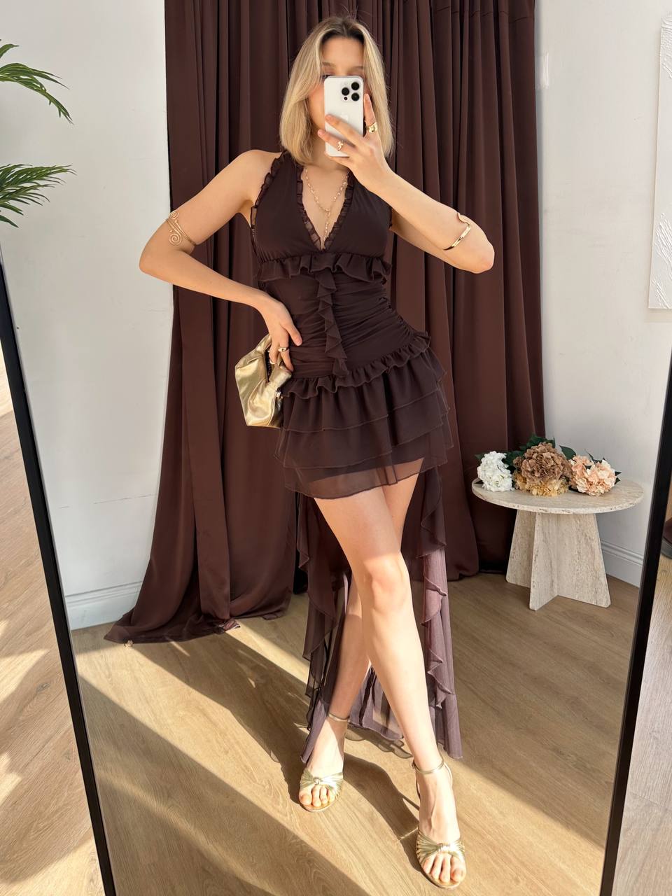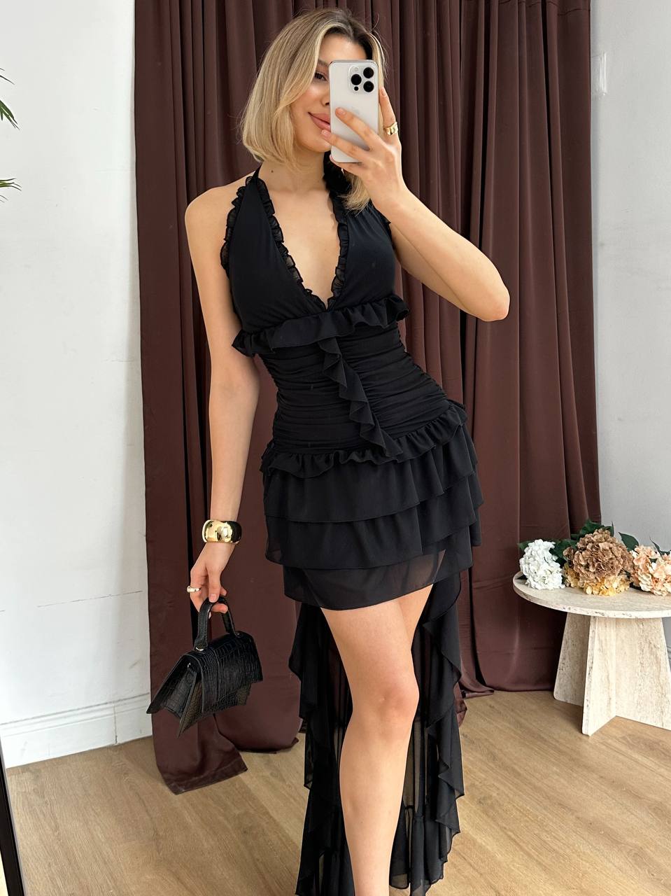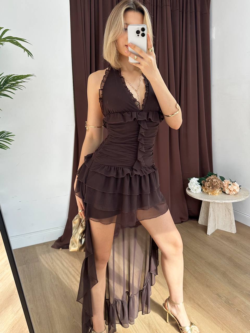 Women short dress that comes in sizes S,M,L. 95% polyester.